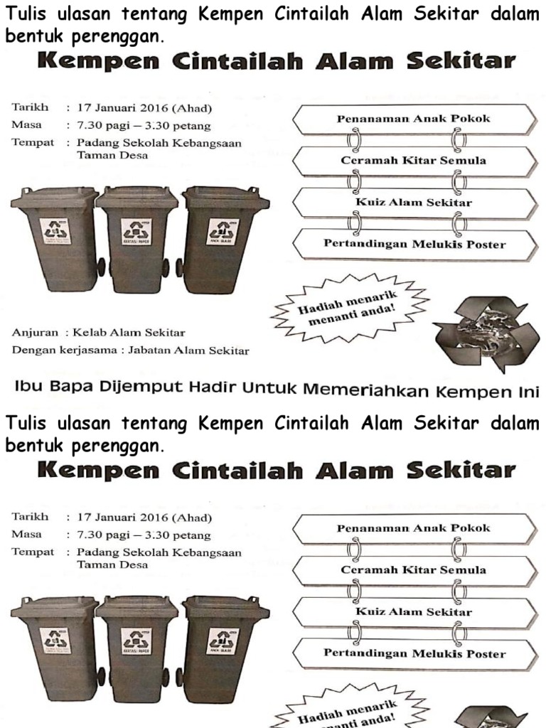 Karangan kempen alam sekitar. Selain pengurangan kos penggendalian sampah sarap pengurangan pencemaran alam sekitar dan sebagainya membawa kebaikan kepada diri kita sendiri. Contoh Kempen Kesedaran Alam Sekitar contoh resume lepasan spm dalam bahasa melayu contoh resume ringkas dalam bahasa melayu contoh report ctu 555 contoh rumah mesra rakyat johor contoh resume objektif dan matlamat kerjaya contoh rumah mesra rakyat 2021 contoh rpi bahasa melayu pendidikan khas contoh rumusan kerja kursus. Selain dapat memelihara alam sekitar aktiviti ini juga telah menambahkan tabungan kelab hasil jualan barang-barang terpakai tersebut kepada kedai kitar semula.